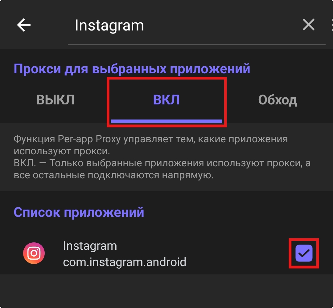 В открывшемся меню достаточно выбрать «ВКЛ» в разделе «Прокси для выбранных приложений» в верхней части приложения. В открывшемся меню достаточно установить флажок напротив необходимых приложений. Например, выбрав любой браузер или «Instagram», Happ позволит этому приложению работать с использованием VPN, а приложение «Госуслуги» не будет сигнализировать о подключённом соединении.