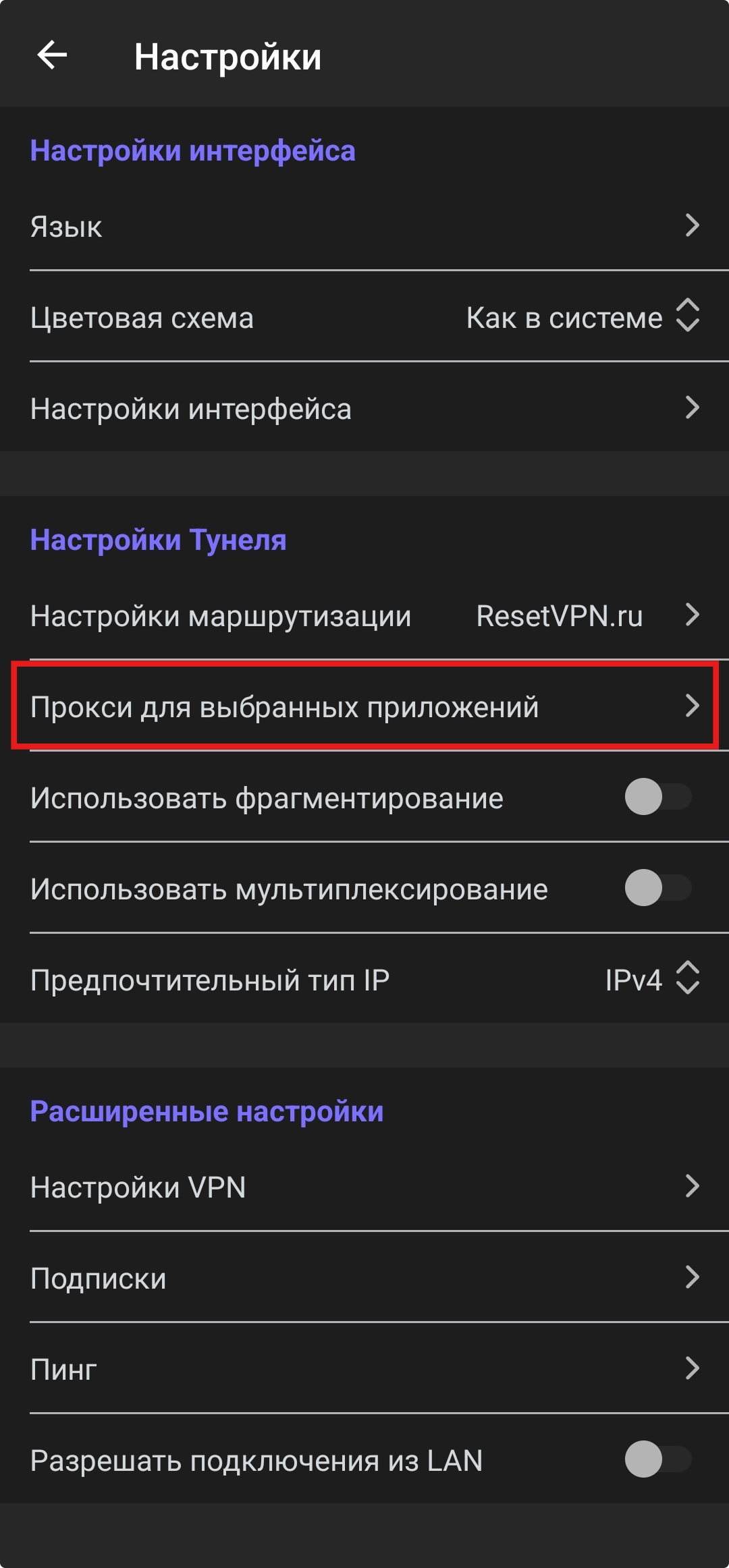 Перейдите в раздел «Прокси для выбранных приложений».