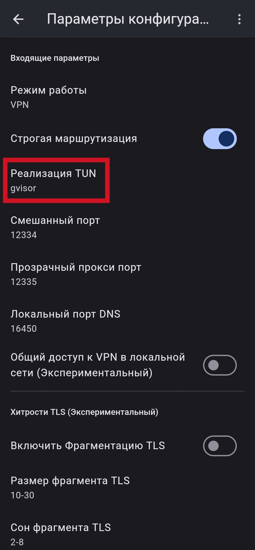 Прокрутите вниз до пункта «Реализация TUN» и выберите «gvisor».