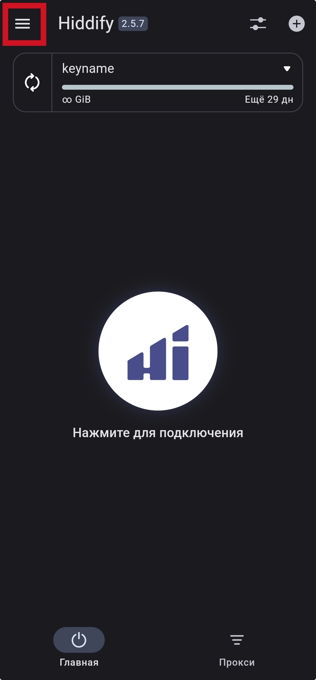 Выполните подключение к VPN с помощью кнопки с фиолетовым логотипом Hiddify.