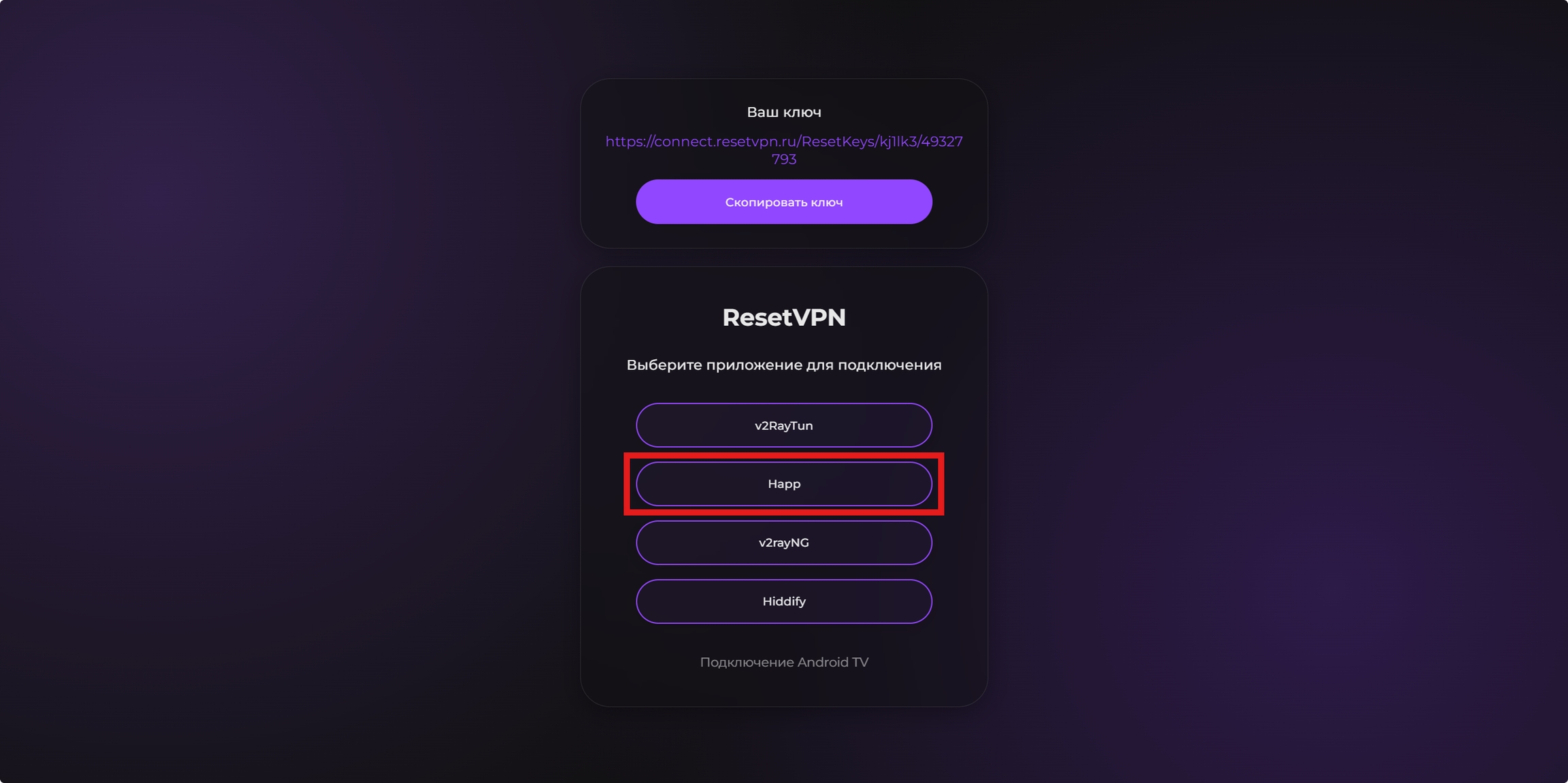 После уведомления о том, что ключ скопирован, перейдите в приложение Happ.