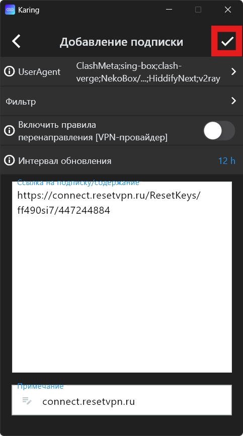 Подтвердите добавление нажав на «✔️» (галочка) в правом верхнем углу приложения.