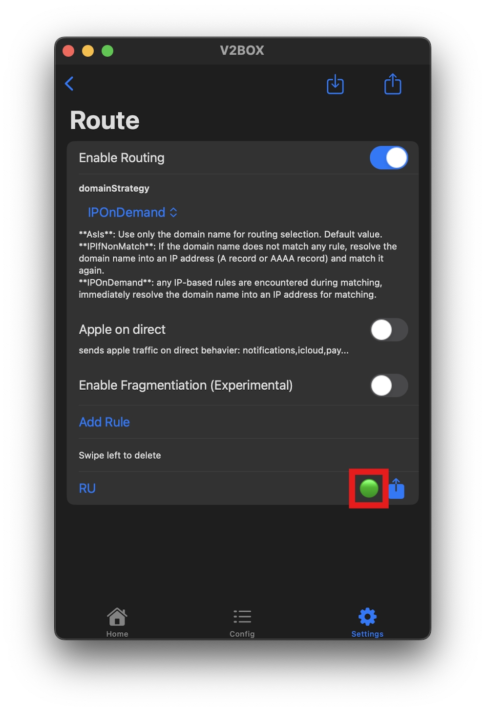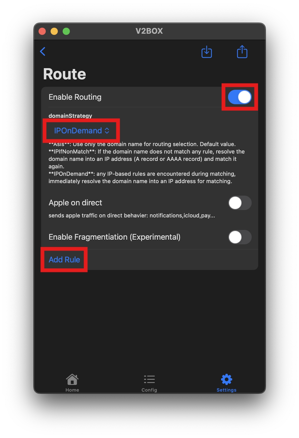 В открывшемся меню установите флажок «Enable Routing» в активное положение, в разделе «domainStrategy» выберите «IPOnDemand». Затем перейдите в пункт «Add Rule».