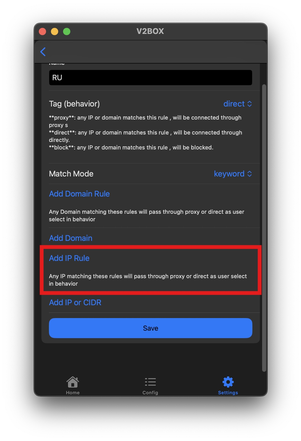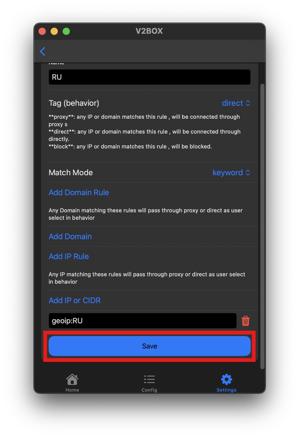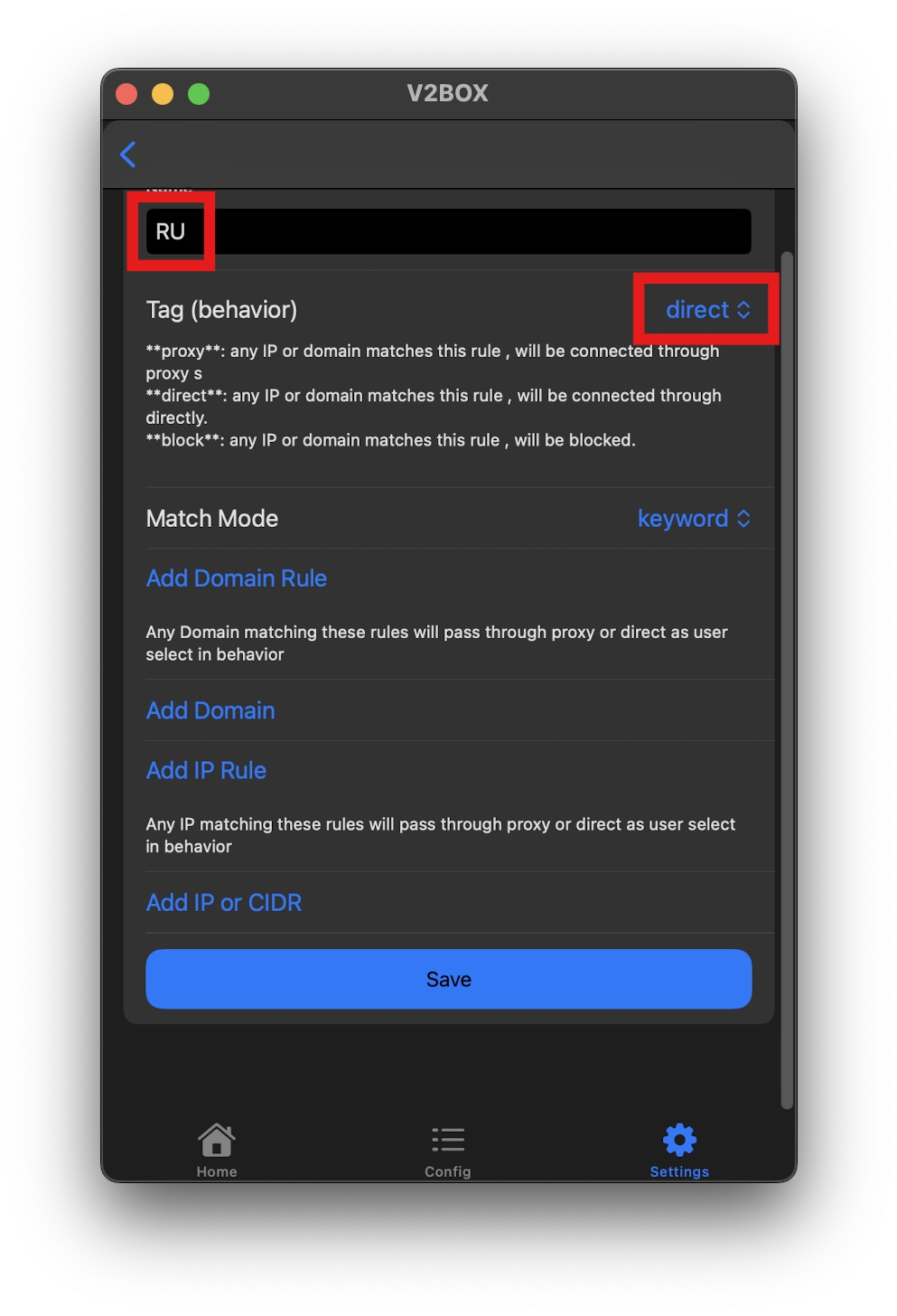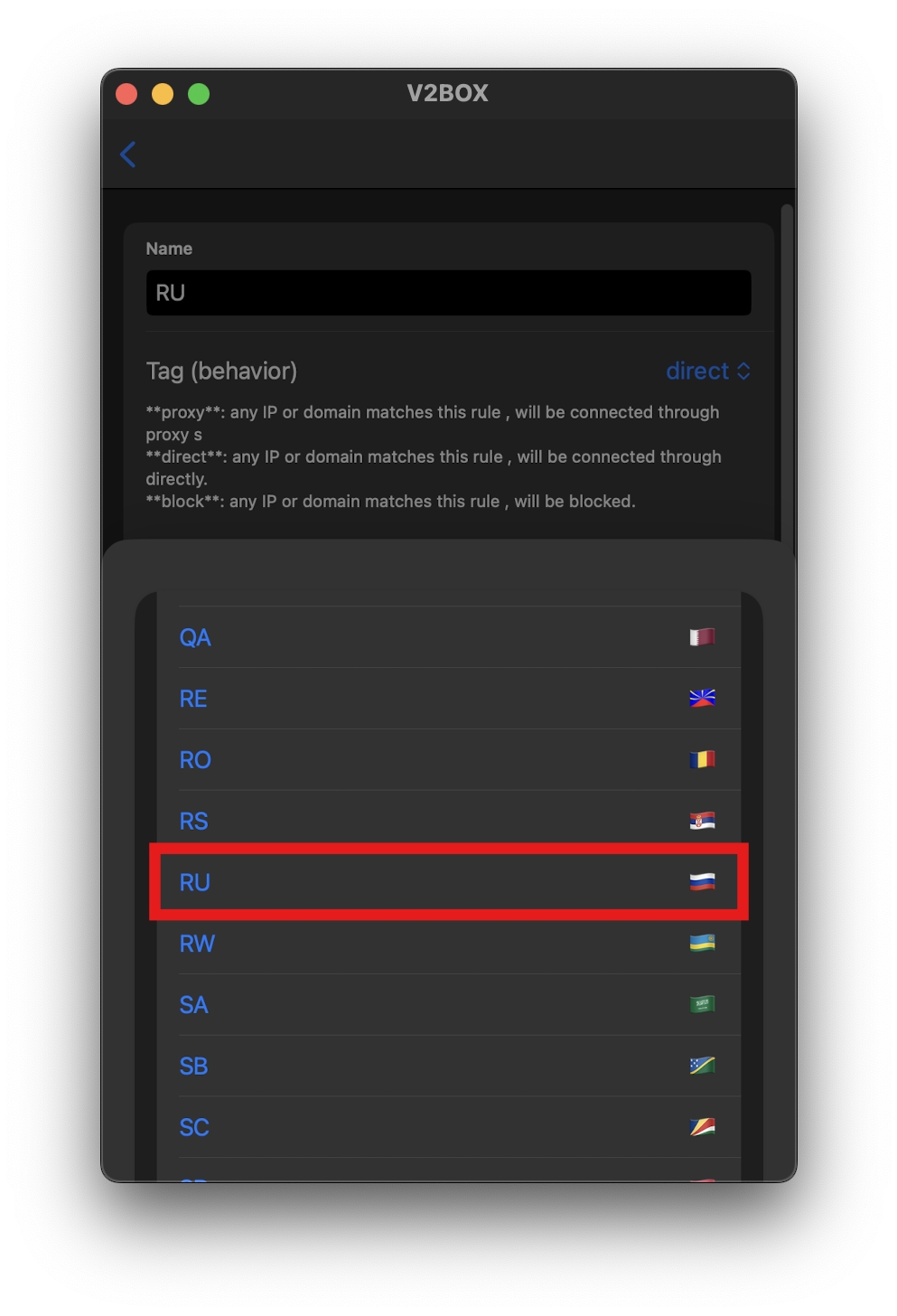 В открывшемся меню задайте любое имя для правила, например «RU». В разделе «Tag (behavior)» выберите «direct».
