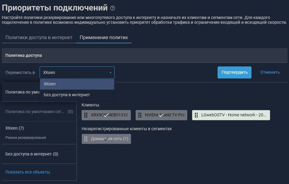 Перейдите в раздел: Приоритеты подключений > Применение политик