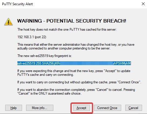Подтвердите добавление ключа безопасности в кэш программы PuTTY для продолжения установки соединения.
