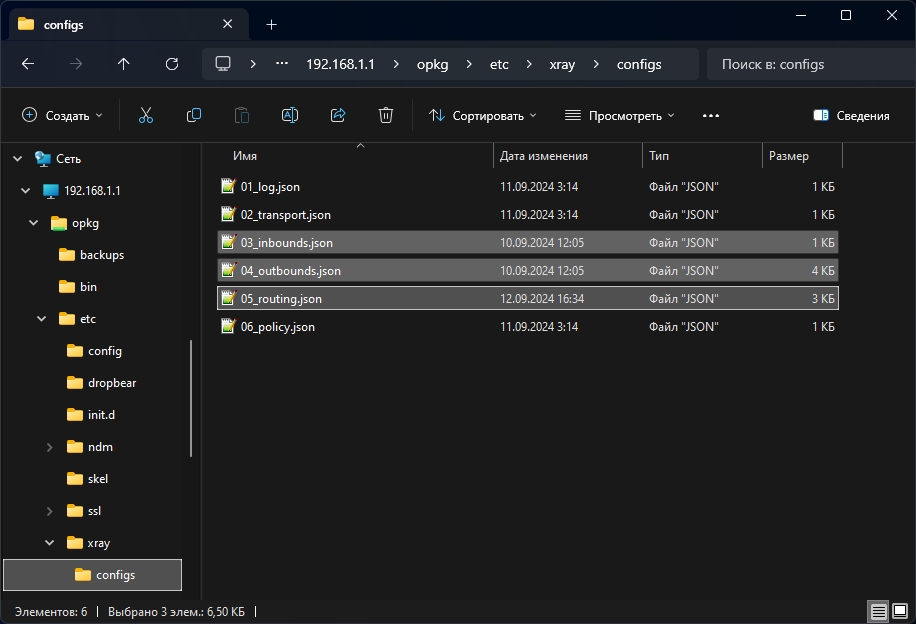 Нас интересуют только три файла: 03_inbounds.json, 04_outbounds.json и 05_routing.json.