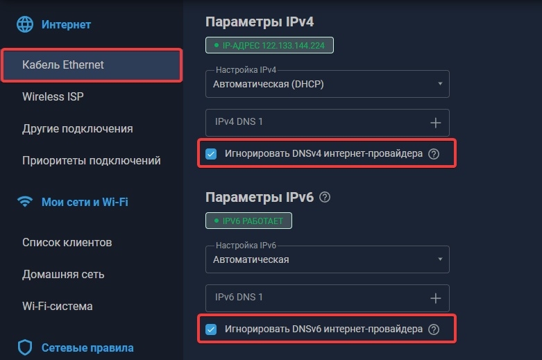 Установите флажок рядом с «Игнорировать DNSv4 интернет-провайдера» и «Игнорировать DNSv6 интернет-провайдера».