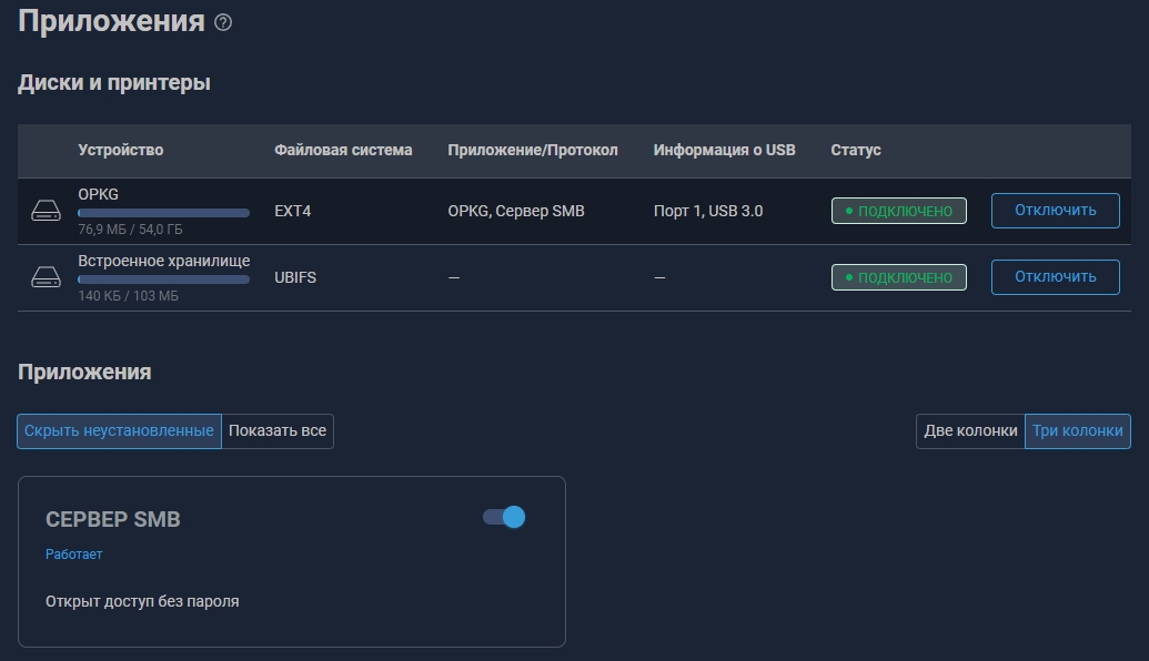 После форматирования подключите подготовленный накопитель с файловой системой EXT4 к USB-порту роутера. Диск должен отобразиться на странице «Приложения» в разделе «Диски и принтеры». Если USB-накопитель не определяется роутером, проверьте, установлен ли компонент операционной системы «Файловая система EXT».