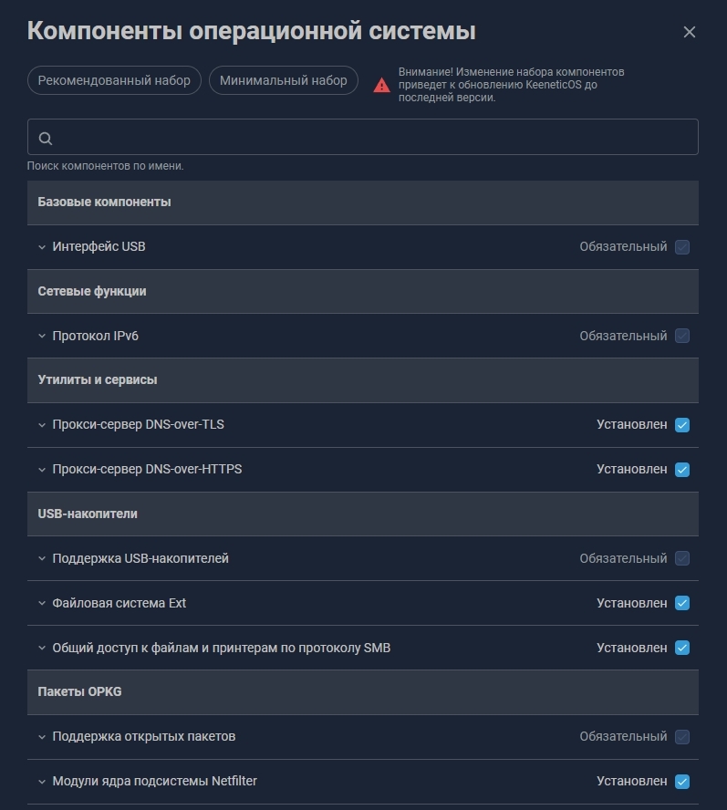В роутере Keenetic установите необходимые компоненты OPKG. Основной и обязательный компонент — «Поддержка открытых пакетов».