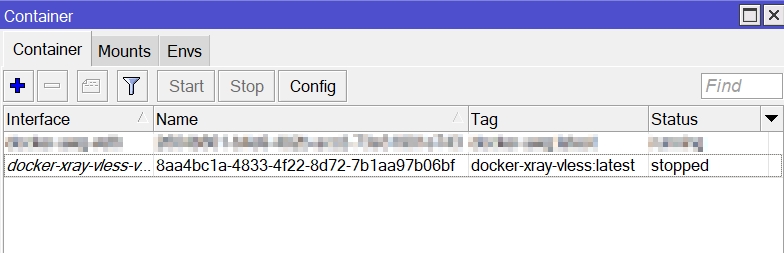 /container/add remote-image=catesin/xray-mikrotik-arm64:latest hostname=xray-vless interface=docker-xray-vless-veth logging=yes start-on-boot=yes envlist=xvr root-dir=ramstorage/container-xray-mikrotikПодождите, пока контейнер полностью распакуется. В результате вы должны увидеть структуру с распакованным контейнером и окружением envs.