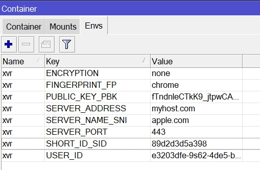 /ip firewall nat add action=masquerade chain=srcnat out-interface=docker-xray-vless-vethСоздадим переменные окружения envs под названием "xvr", которые позже при запуске будем передавать в контейнер.