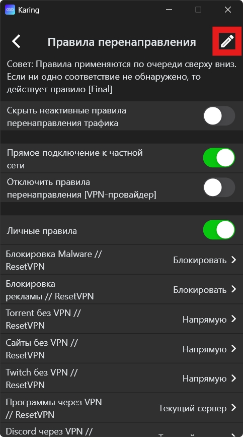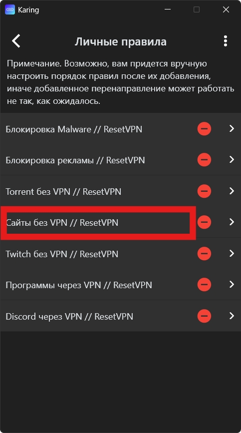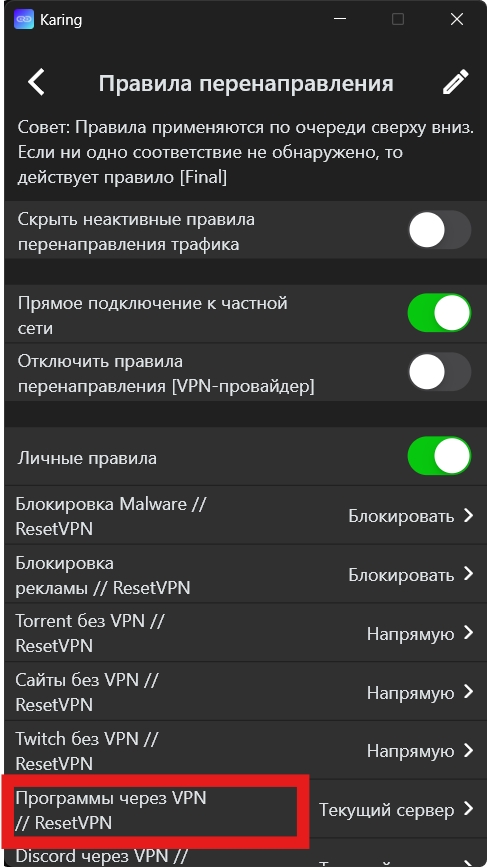 Чтобы добавить программы для подключения через VPN или сайты для исключения, нажмите «Правила».