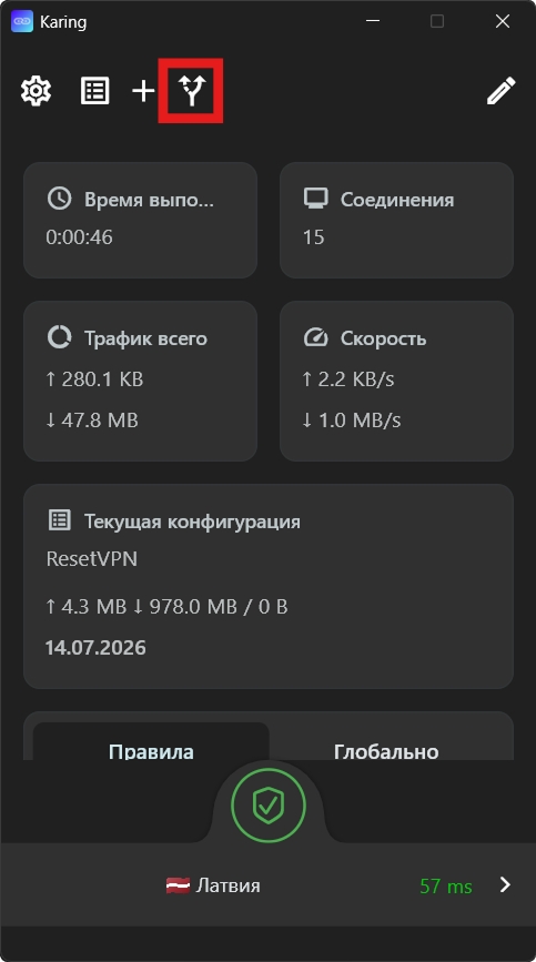 Полное закрытие программы возможно через трей на панели задач. Щёлкните правой кнопкой мыши на иконку приложения Karing и выберите пункт «Выйти».