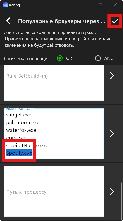 В открывшемся окне в поле «Имя процесса» необходимо с новой строки указать полное название исполняемого файла приложения (.exe). Например, добавление «Spotify.exe» позволит открывать приложение Spotify через VPN.