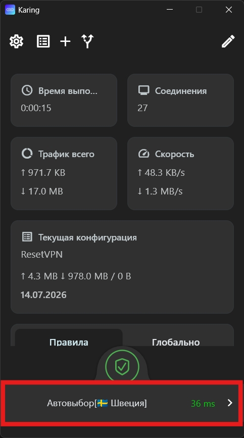 Чтобы отключить VPN, нажмите на кнопку со значком зеленого щита в нижней части приложения.