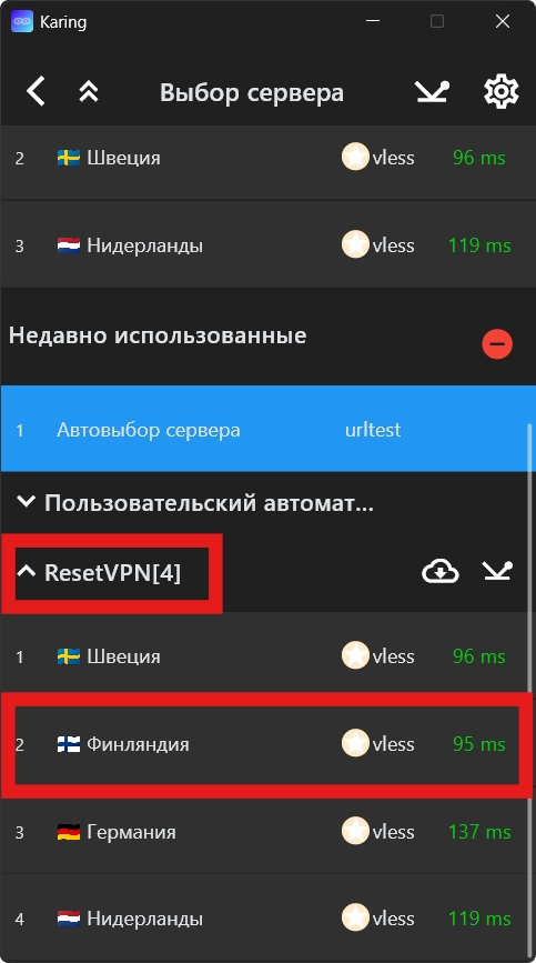 Прокрутите приложение вниз, раскройте меню «ResetVPN» и выберите подходящий сервер для подключения. Если оставить режим «Автовыбор сервера», приложение автоматически будет подбирать сервер с минимальной задержкой при каждом запуске.