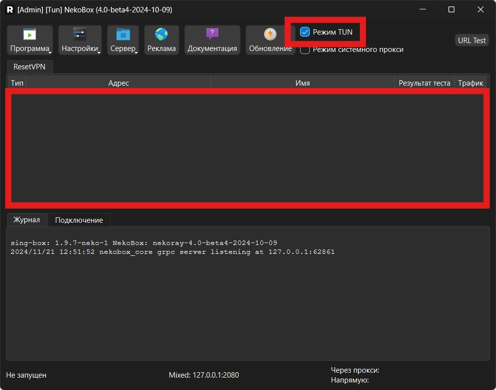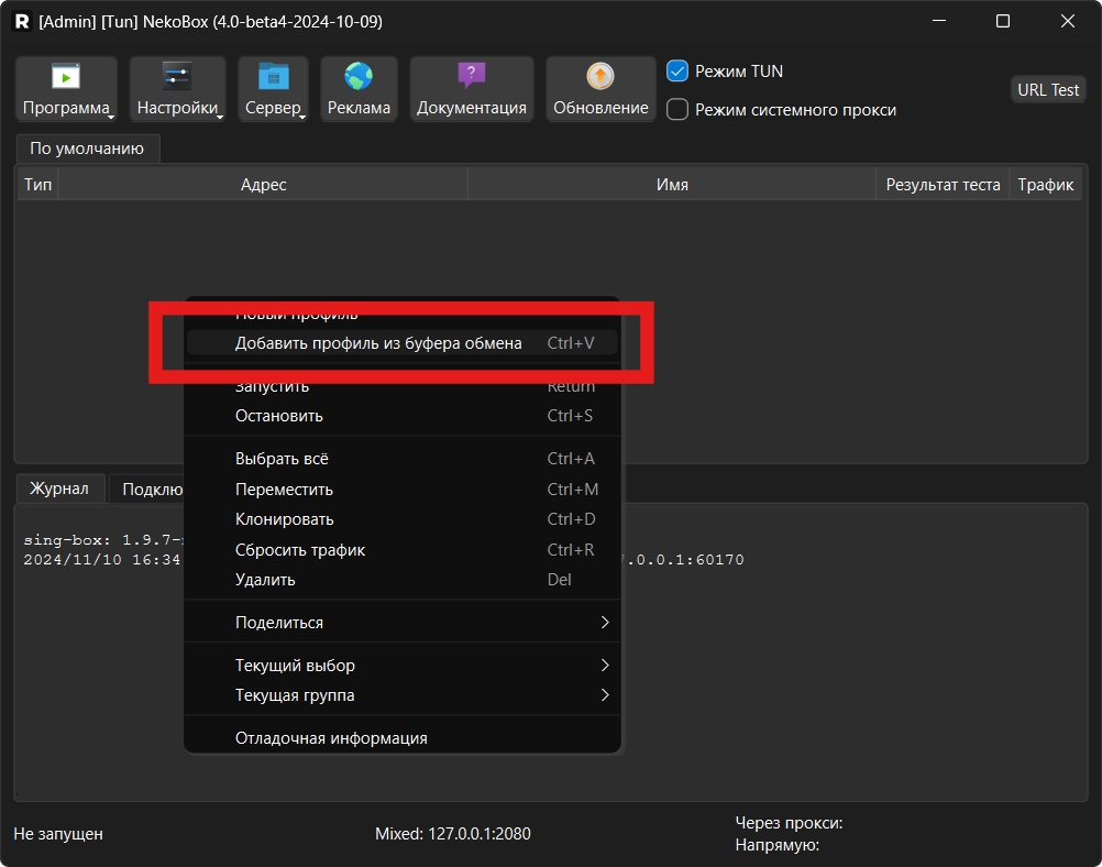 В открывшемся приложении убедитесь, что «Режим TUN» включён. Затем нажмите правой кнопкой мыши по пустому полю в верхней части приложения.