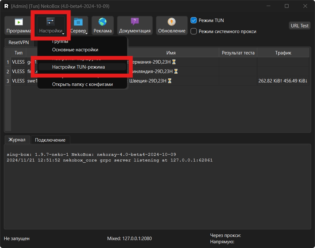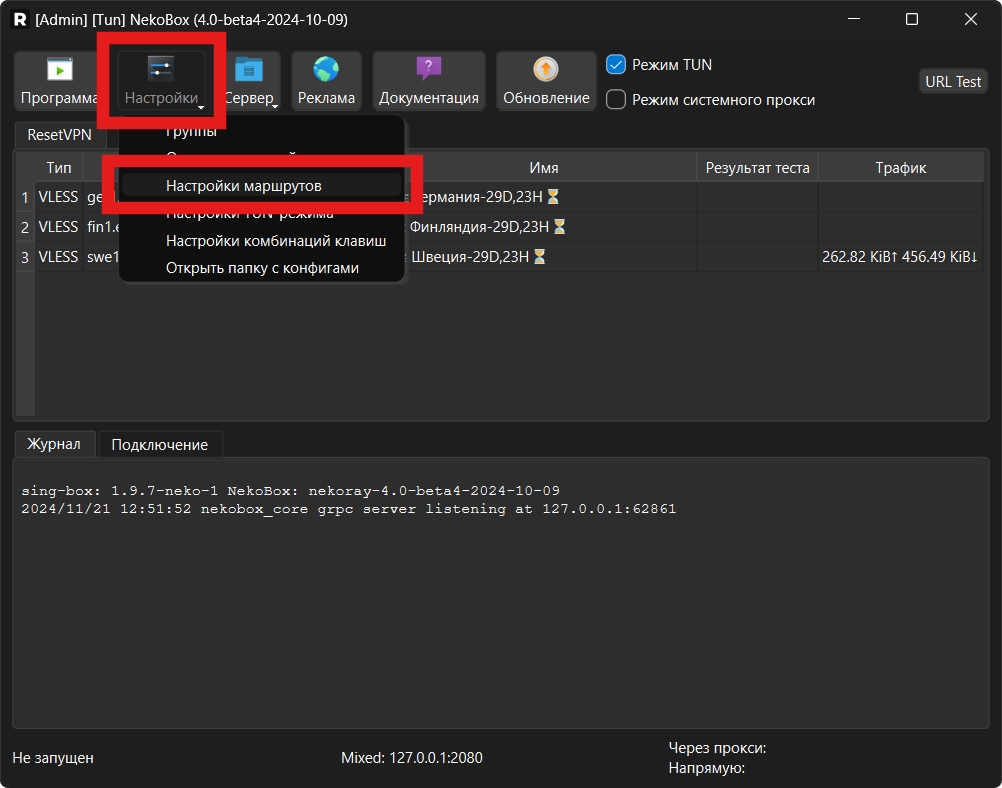 Чтобы добавить программы для подключения через VPN, нажмите «Настройки» и выберите пункт «Настройки TUN-режима».