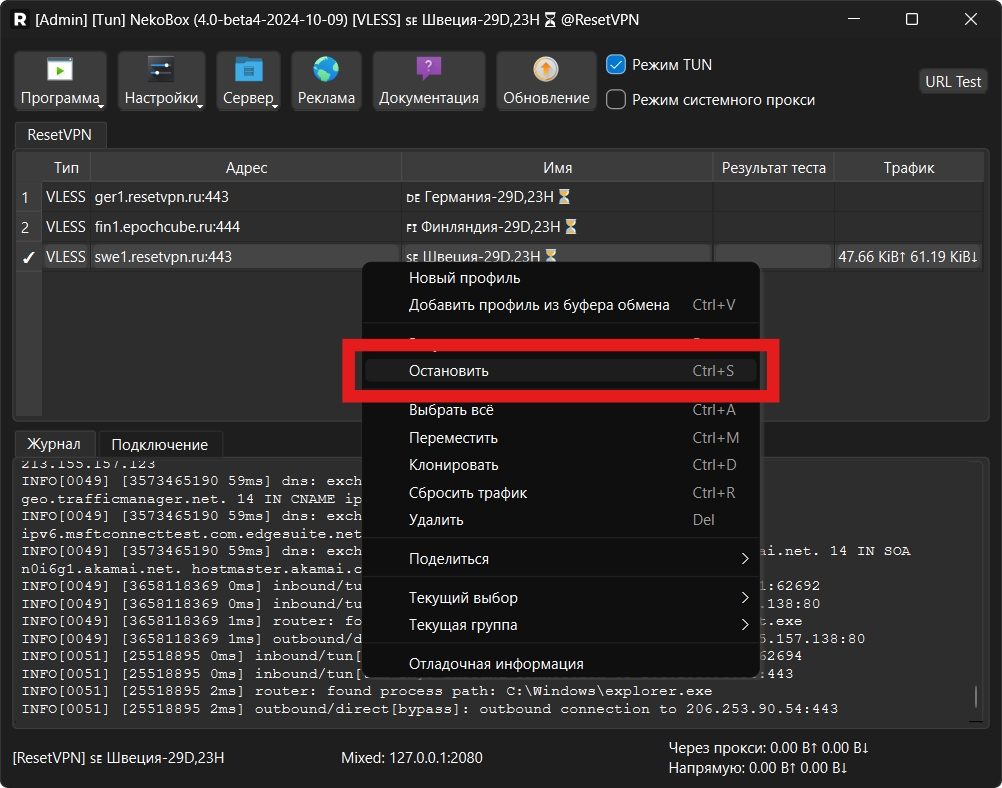 Чтобы отключить VPN, нажмите правой кнопкой мыши по вашему активному ключу и выберите пункт «Остановить» в открывшемся меню.