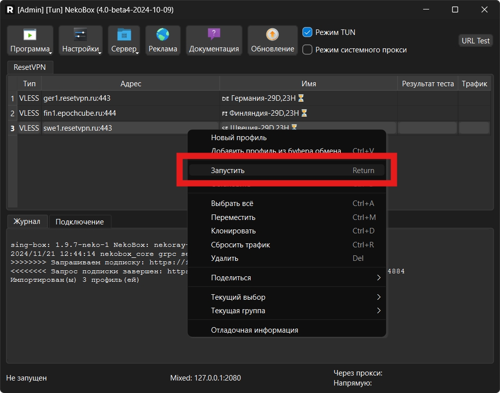 В списке появятся добавленные ключи — их будет несколько, каждый привязан к своей локации. Выбрав подходящую, нажмите правой кнопкой мыши по вашему ключу и выберите пункт «Запустить» в открывшемся меню. Галочка слева от ключа будет означать успешное подключение.