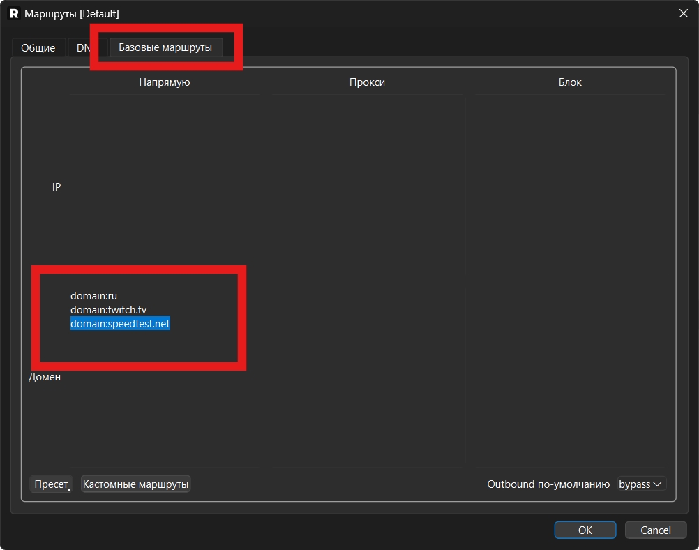 В открывшемся окне в разделе «Базовые маршруты» в поле «Домен» достаточно указать ссылку (speedtest.net) или домен (ru), добавив «domain:» в начале строки. Например, добавление «domain:speedtest.net» позволит открывать сайт Speedtest без использования VPN.