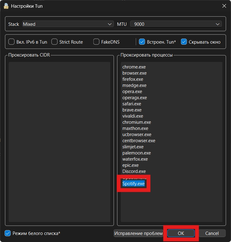 В открывшемся окне в поле «Full process name (Tun mode)» необходимо с новой строки указать полное название исполняемого файла приложения (.exe). Например, добавление «Spotify.exe» позволит открывать приложение Spotify через VPN.