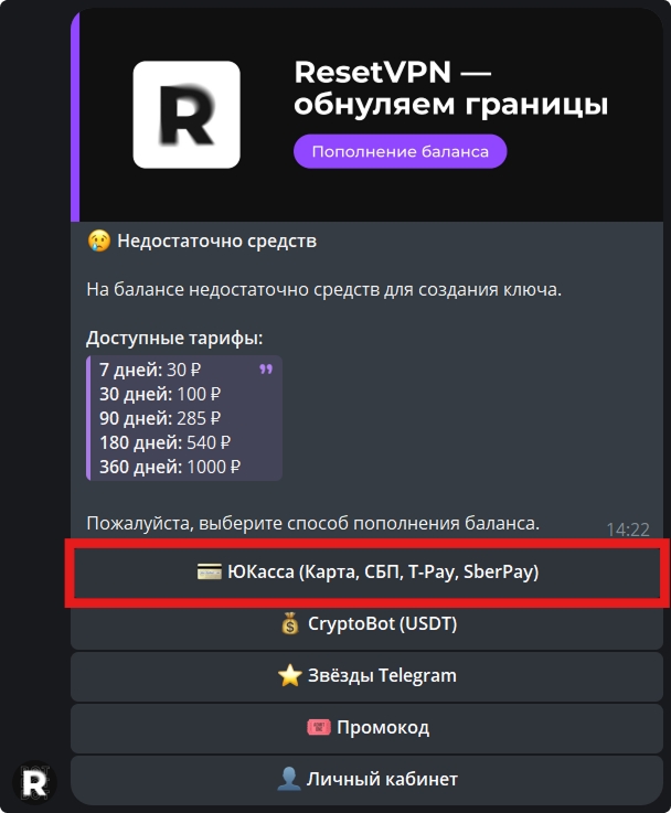Выберите способ пополнения, например, «💳 ЮКасса».
