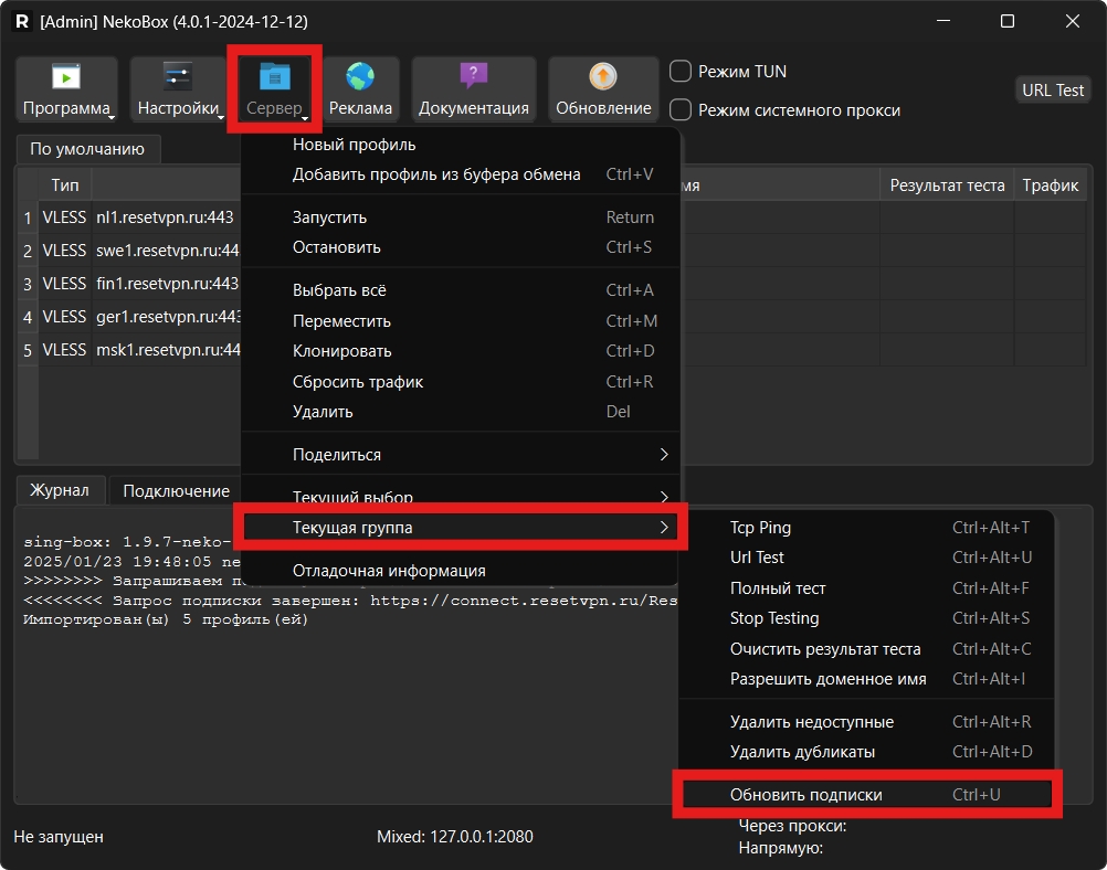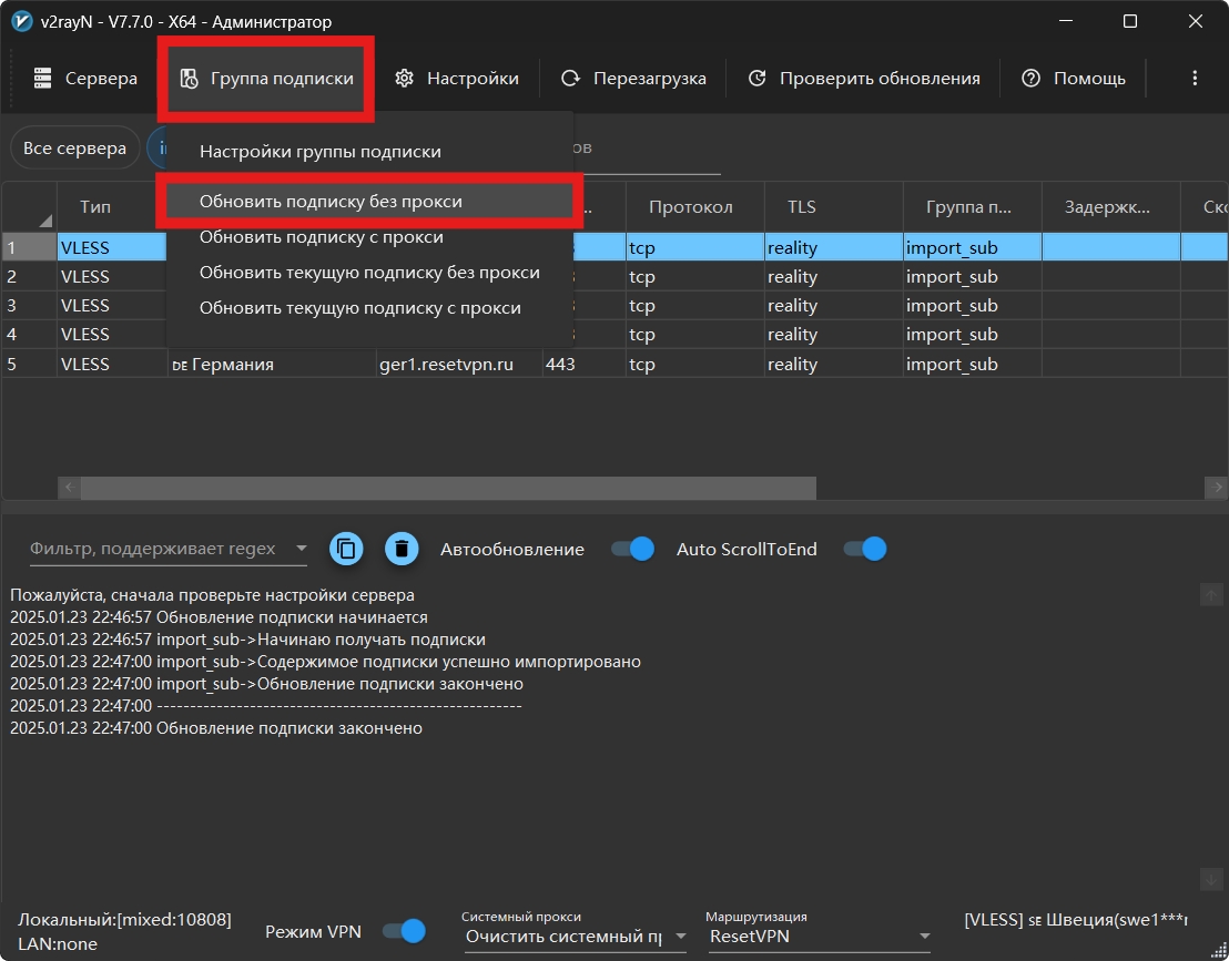 Выберите «Группа подписки». В открывшемся меню выберите «Обновить подписку без прокси».